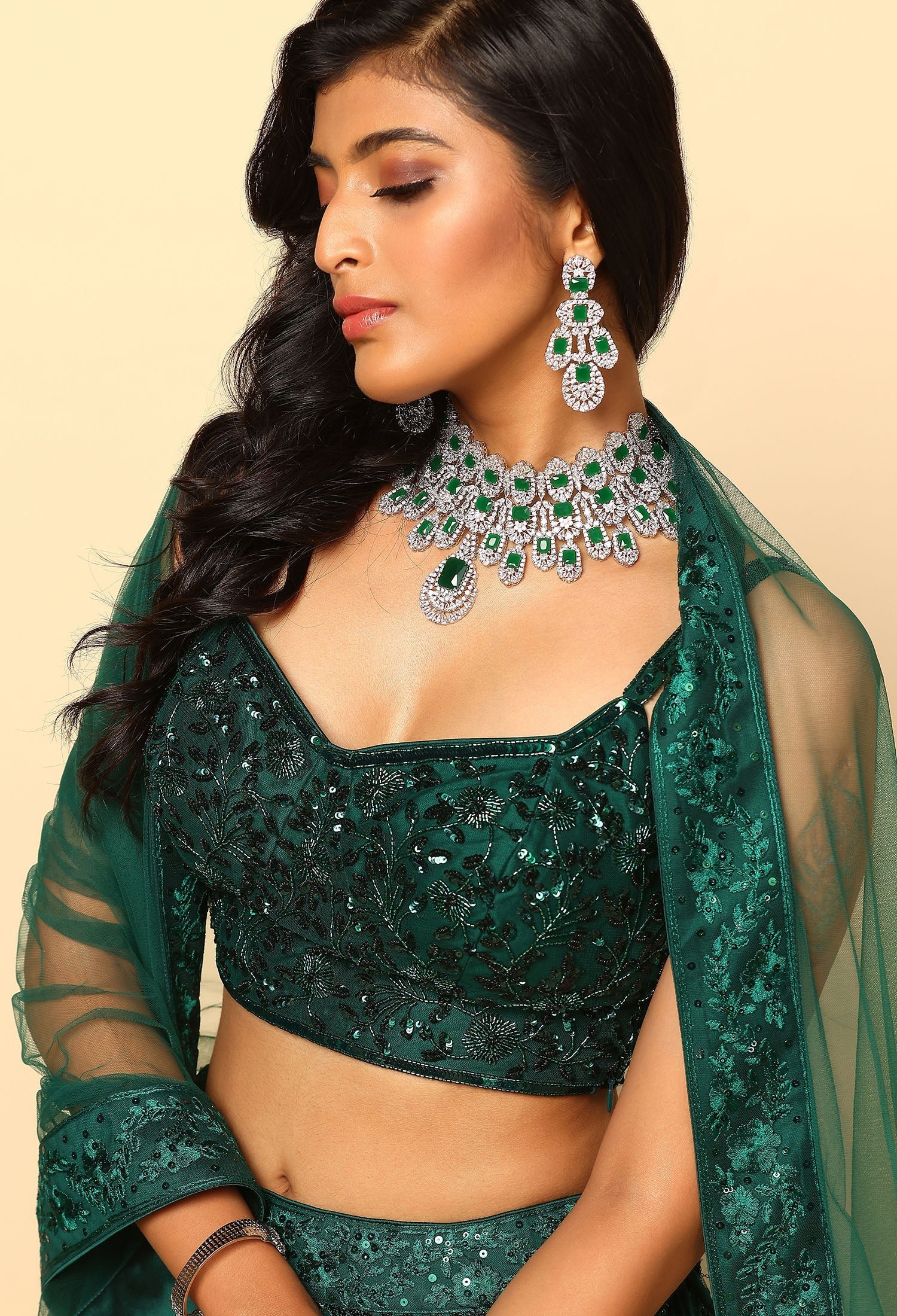 A stunning bottle green lehenga with delicate tone-on-tone sequins and beads, flowing net skirt, and soft dupatta. Perfect for day or night celebrations, festive occasions, and special moments, making you shine at every event.