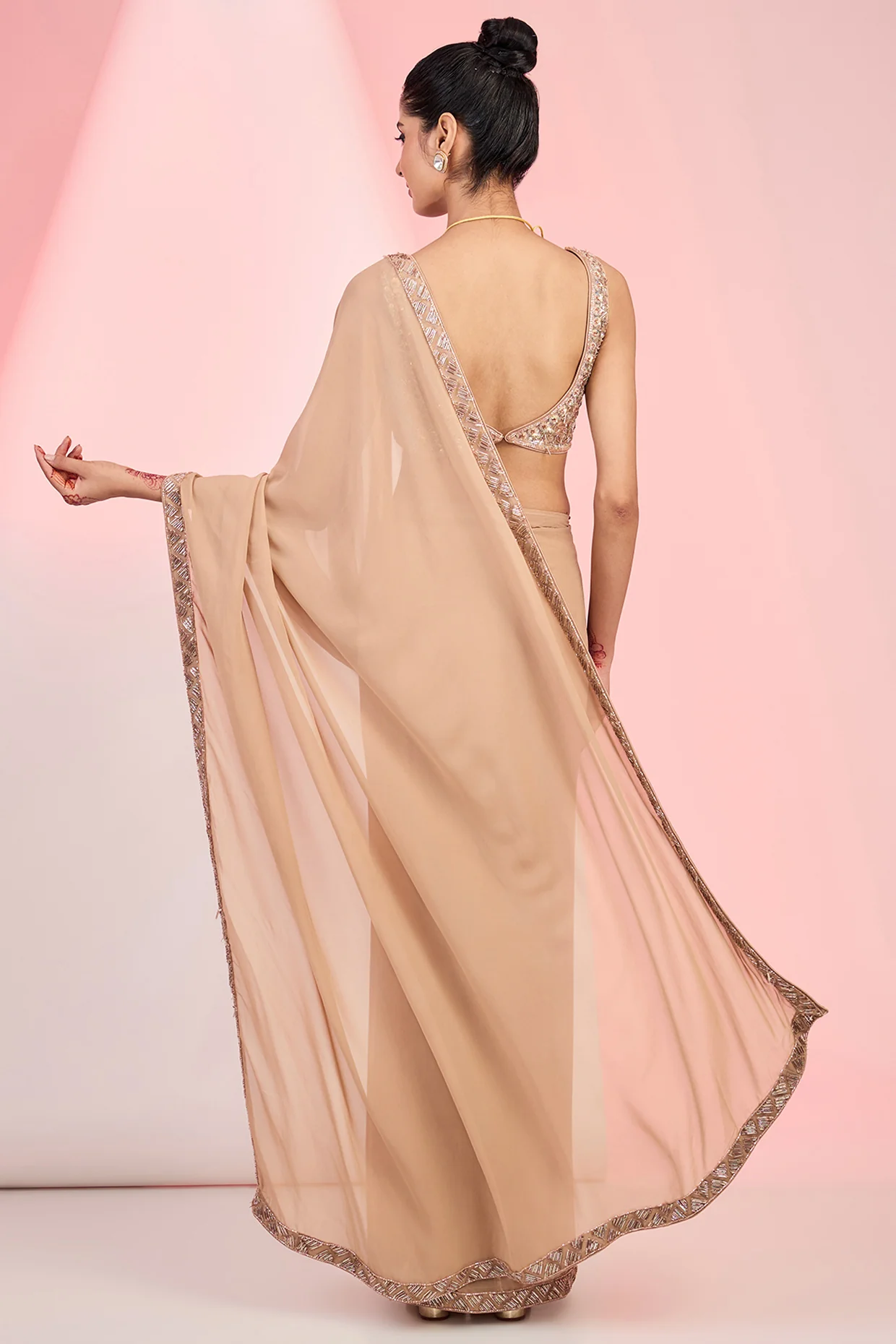 Georgette saree with net blouse, hand-embellished cut dana, sequins, and beads—perfect for weddings and special occasions.