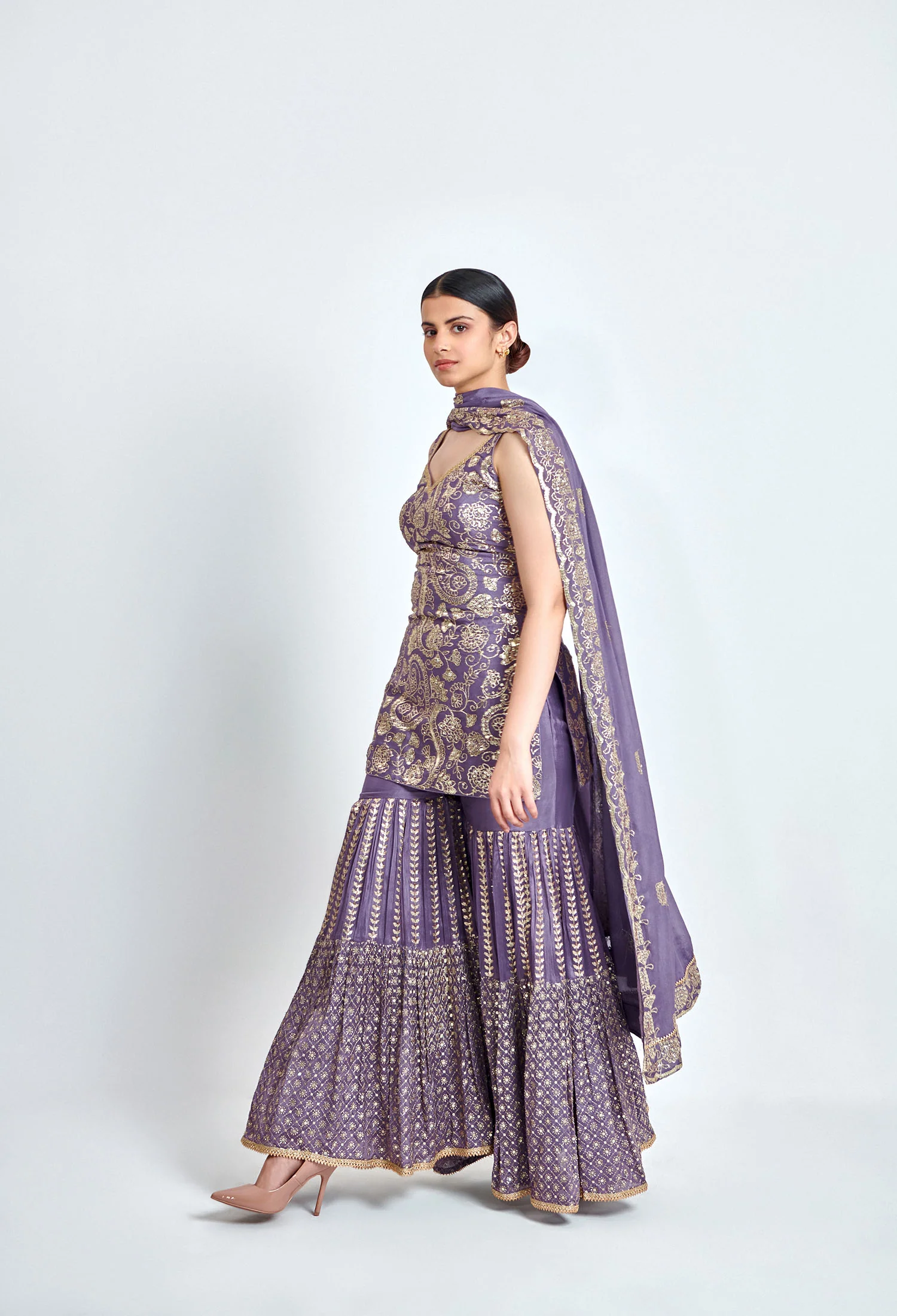 Crafted in soft Chinon fabric, this mauve and gold sharara features rich sequin embroidery with three elegant embroidery styles.