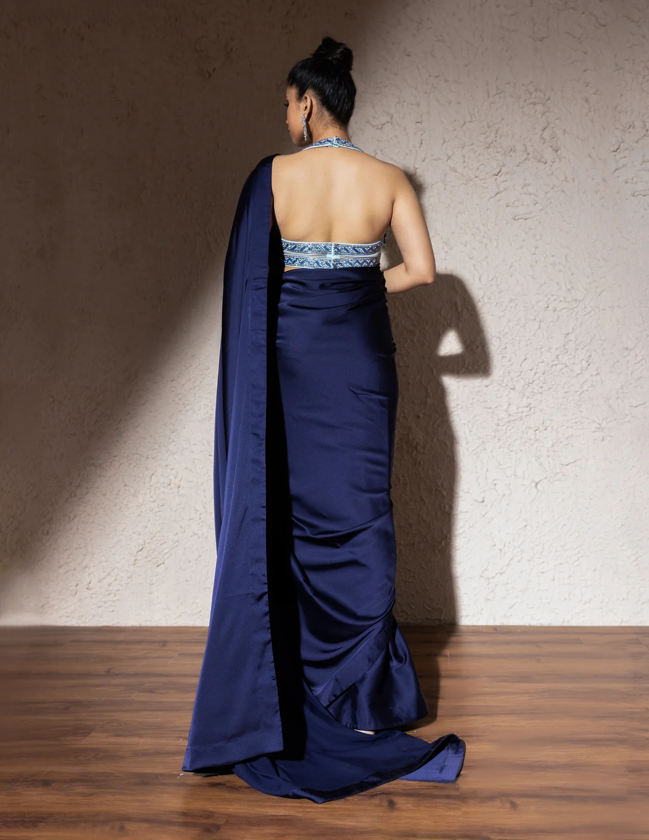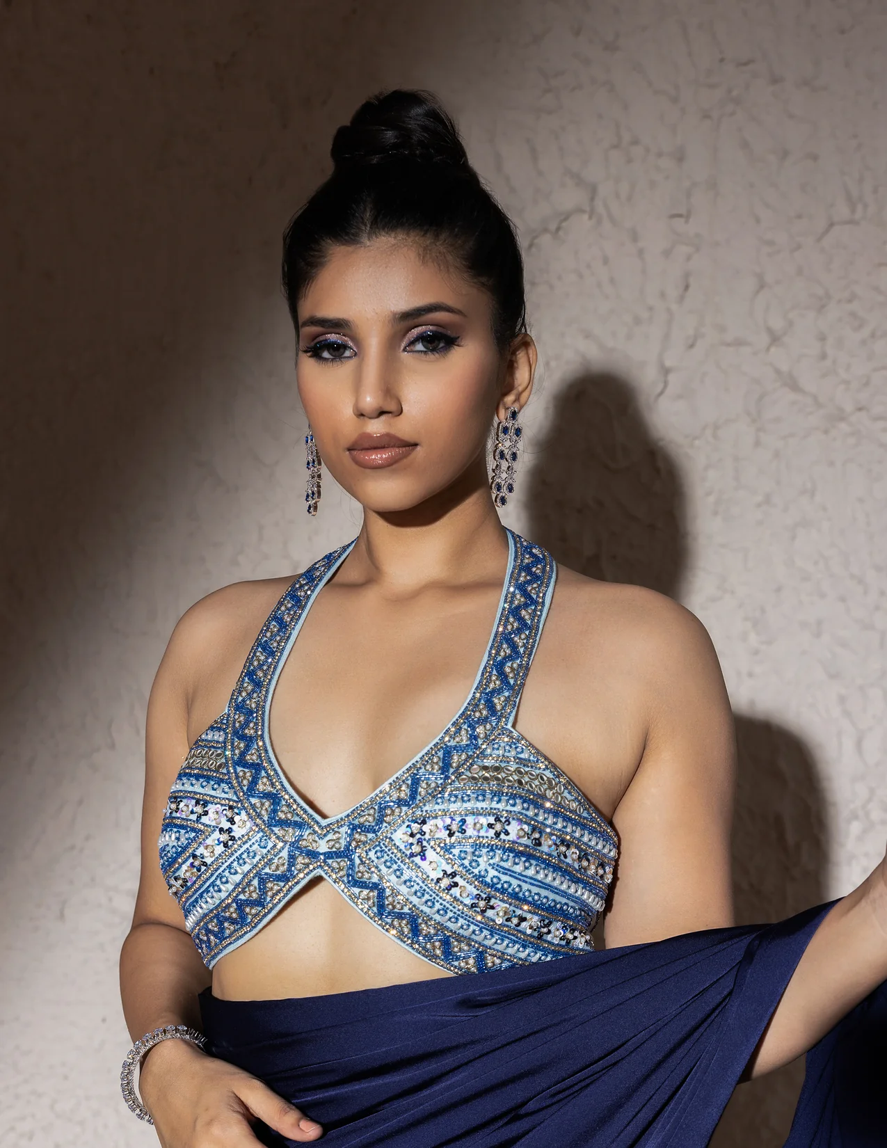Intricately embroidered halter-neck blouse with blue-silver beadwork and mirrors, paired with an elegant blue Armani satin saree.