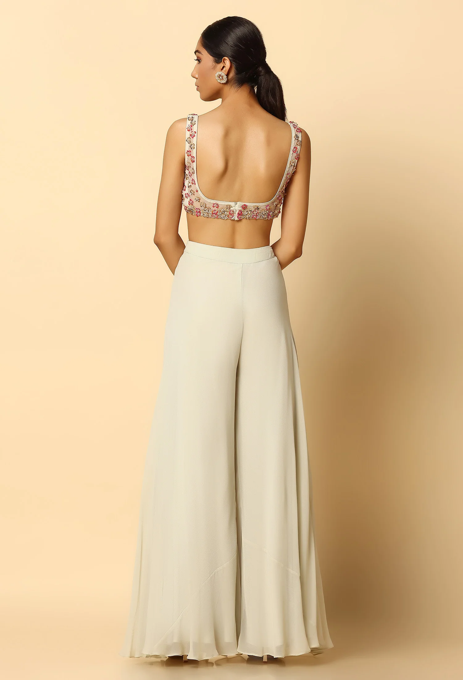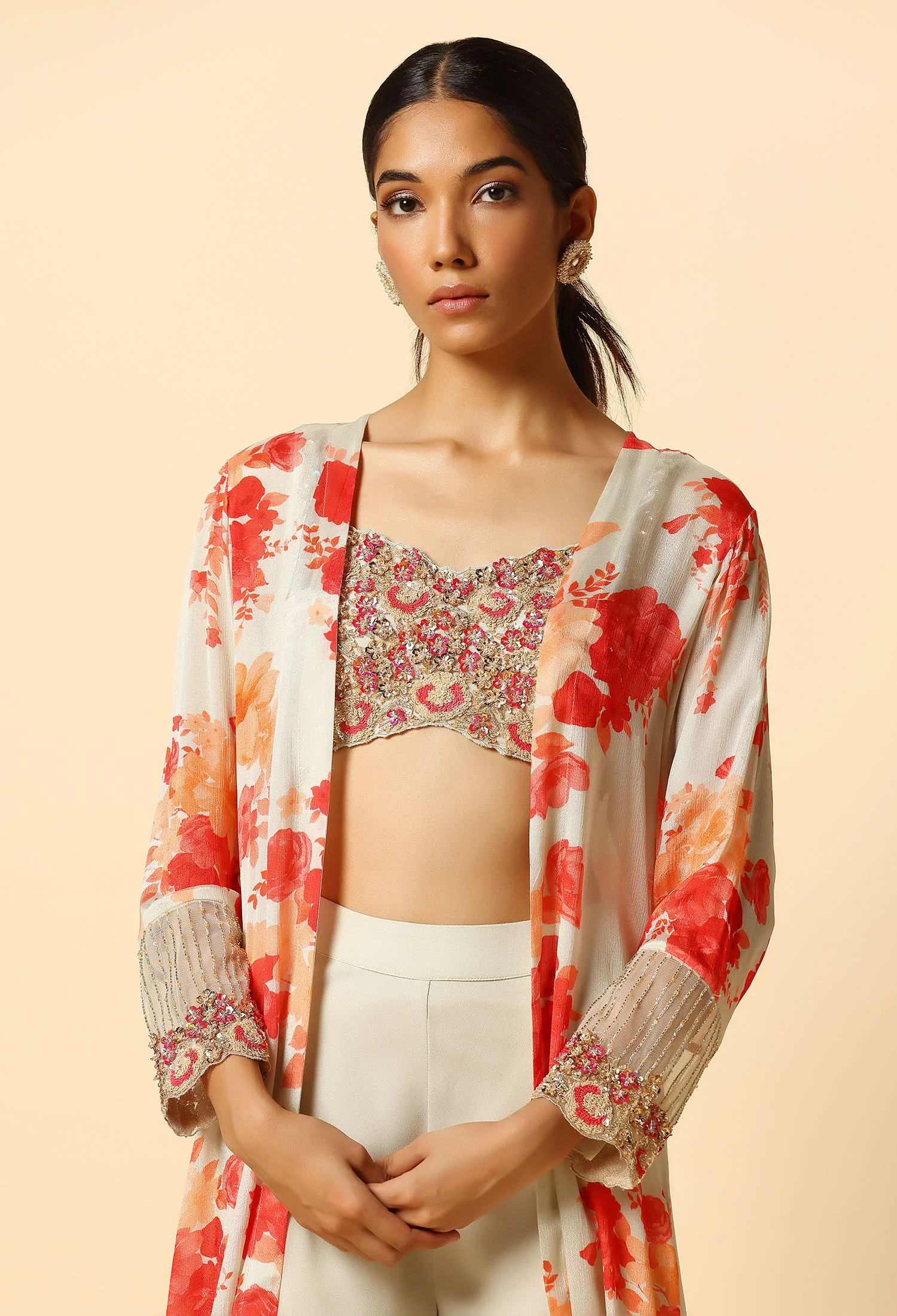Elegant ivory gharara set with embroidered blouse and floral printed cape, detailed with pearls, cutdana, and sequin accents.
