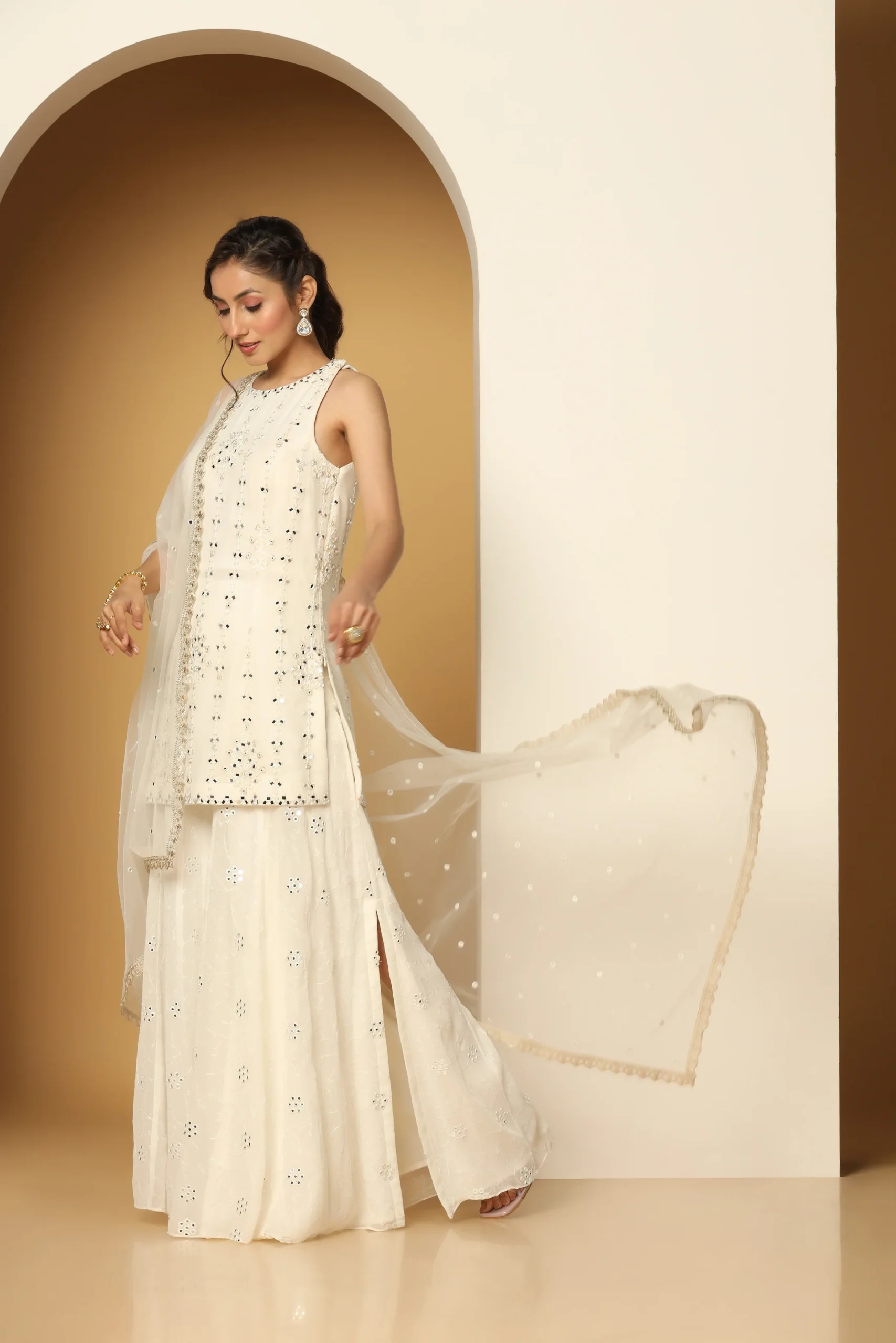 White Georgette Gharara Set, featuring intricate thread, mirror, resham, cutdana, and sequin embroidery. Paired with matching georgette Gharara pants and a delicate net dupatta, it perfectly combines traditional artistry with modern sophistication for festive celebrations.